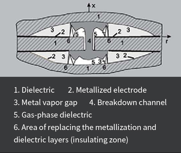 电容器绕组介质采用渐变式金属化聚丙烯薄膜,通过局部击穿,蒸发金属颗粒,重新形成绝缘区,使电容器自我隔离故障点,继续正常工作,达到自愈功能。同时因击穿导致的容量损失极少,可忽略不计,不影响电容器的正常使用。