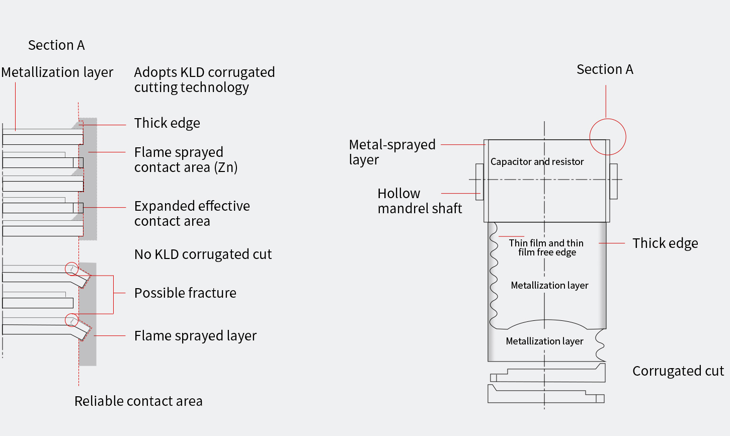 电容器采用薄膜厚边加强技术,可提高喷金面与电极的可靠连接。内部薄膜采用波纹、平滑相结合的切割方式,可使元件与金属喷层间产生最大的有效面,提高浪涌电流抑制能力。