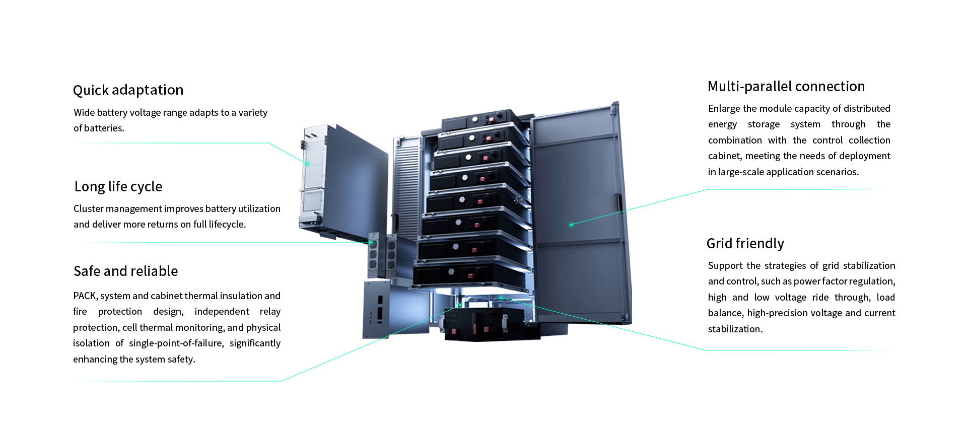 Distributed energy storage with multiple Parallel connections can meet the needs of megawatt-scale energy storage power plants. String systems are more efficient and safer, reducing costs of on-site deployment.