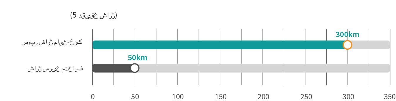توان شارژ ترمینال سوپرشارژ مایع خنک DC به 600kW می رسد، و فناوری اتلاف حرارت با مایع خنک با تنظیم هوشمند، نیازهای اتلاف حرارت کابل را زمانی که جریان 600A است برآورده میکند. میتواند فرآیند تکمیل انرژی را با عمر باتری 300+km پس از 5 دقیقه شارژ کامل نماید، تجربه ی شارژی را خواهید داشت که گویی با بنزین سوختگیری می کنید و نیازهای شارژ سریع را به حداکثر میرساند.