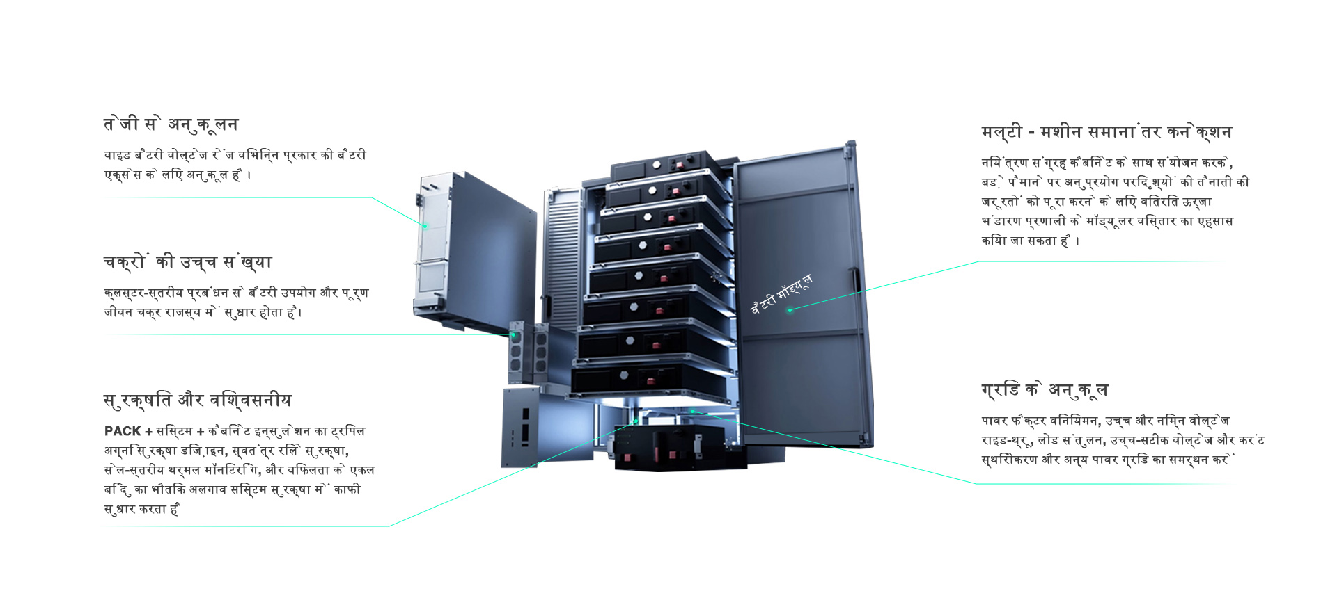 मल्टीपल वितरित ऊर्जा भंडारण मशीनों का समानांतर कनेक्शन मेगावाट स्तर के ऊर्जा भंडारण बिजली स्टेशनों की आवश्यकताओं को पूरा कर सकता है। स्ट्रिंग सिस्टम में उच्च दक्षता और सुरक्षा है, और ऑन-साइट परिनियोजन लागत कम है ।