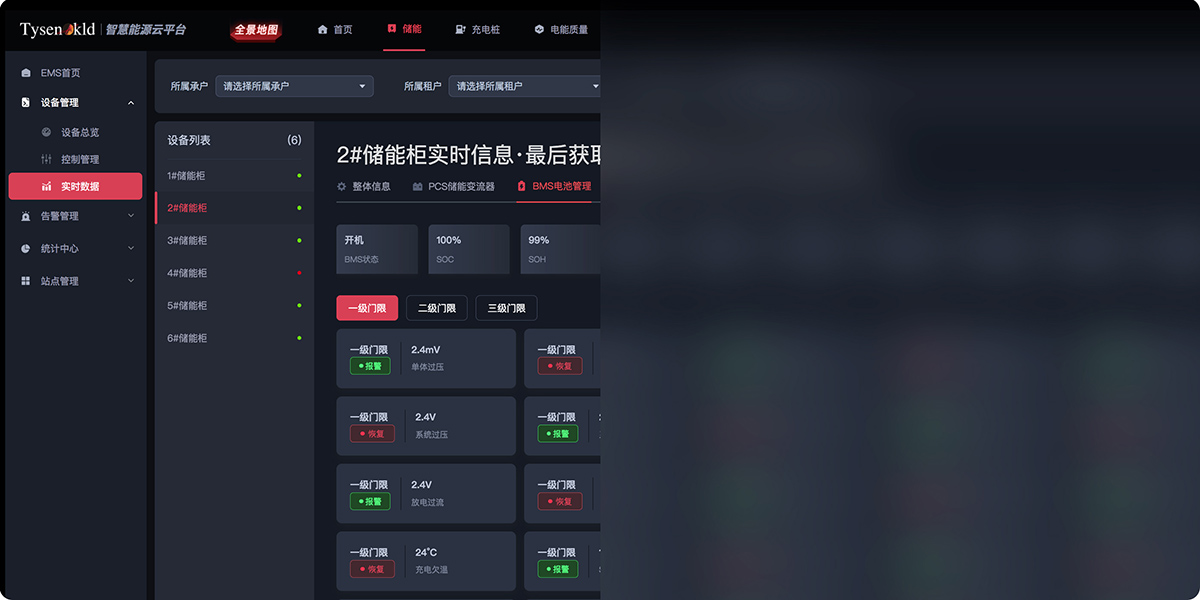 設備情報のリアルタイム総覧、パラメータ制御の秒級発行、警報通知及び除去記録管理、費用報告表統計、履歴データの精確検索、独占の革新的でドラッグ化された省別時間帯電力価格管理のリアルタイムプレビュー技術、PCS全システムパラメータ管理、BMS管理は各バッテリーセルの状態電圧と温度、日月年総充放電収益管理と報告表、エネルギー貯蔵キャビネットの消火消防モジュール制御、エアコンメーターの精確な計量制御まで精確にすることができ、テナントモードを保有し、複数の部下代理サブアカウントを管理、新設し、サブアカウントのEMS発電所を創建することができる。